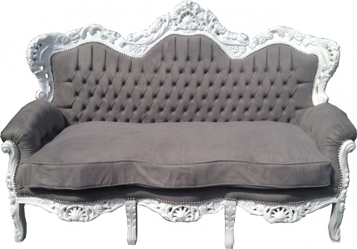 Handgefertigtes Barock Sofa „King“ aus dem Hause Casa Padrino Farbe: Grau / Weià Breite ca 184 cm Höhe: ca 125 cm Tiefe: ca 81 cm Sitzhöhe:ca 45 cm Material: Massivholz. Bezogen mit einem edlem Samtstoff (80% Baumwolle / 20% polyester) Handarbe