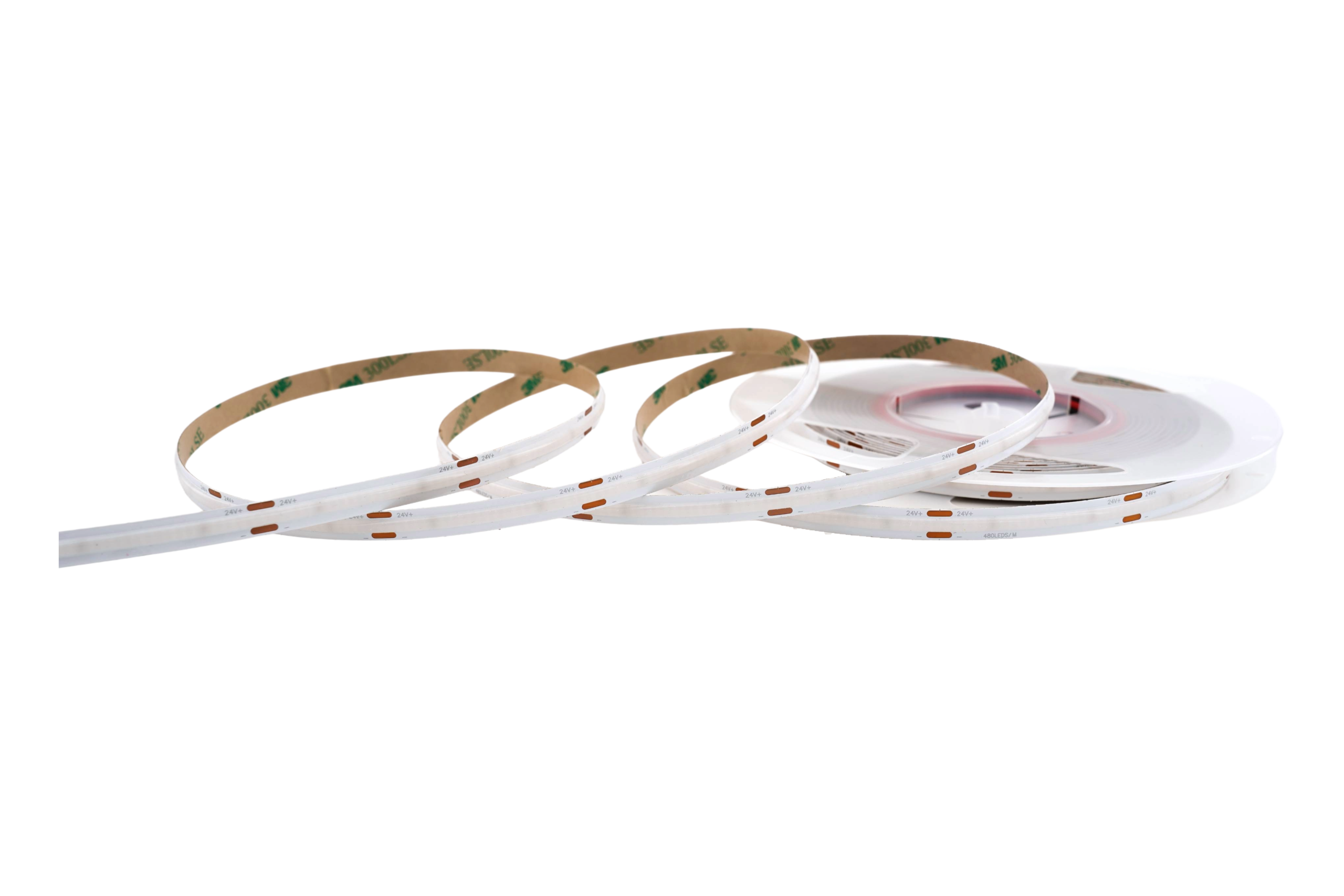 Erleben Sie satte Farben und eine beeindruckend gleichmäßige Lichtverteilung mit unserem COB LED Streifen (24 V) mit 480 LEDs pro Meter. Dank der modernen COB-Technologie entsteht ein nahezu durchgehendes Lichtband ohne sichtbare Lichtpunkte – ideal für hochwertige Lichtinstallationen im Innen- und gewerblichen Bereich. Die LED-Streifen sind in sieben brillanten Farbvarianten erhältlich: Rot, Grün, Blau, Pink, Lila, Cyan (Hellblau) und Orange (Amber). Mit einer Leistungsaufnahme von nur 10 W pro Meter bieten sie eine energieeffiziente und dennoch sehr leuchtstarke Lösung für vielseitige Anwendungen – von Akzentbeleuchtung über Messebau bis hin zu stimmungsvoller Gastronomiebeleuchtung. Standardmäßig sind die Streifen in der Schutzart IP33 erhältlich, was sie ideal für trockene Innenräume macht. Auf Wunsch bieten wir Ihnen jedoch auch Varianten in IP65, IP66, IP67 oder IP68 an – optimal für Feuchträume oder den geschützten Außenbereich. Darüber hinaus können die LED-Streifen auf Wunsch individuell konfektioniert werden – beispielsweise mit Steckverbindungen, Lötarbeiten, vorkonfektionierten Längen oder vorkabelt mit Anschlussleitungen. So erhalten Sie eine maßgeschneiderte Lösung für Ihr Projekt – ganz ohne Aufwand. Rückseitig sind die LED-Streifen mit einem hochwertigen 3M-Klebeband ausgestattet, das eine einfache und sichere Montage ermöglicht. Sie lassen sich problemlos kürzen und sind mit professionellen Steuerungen wie PWM-Dimmern, DMX- oder DALI-Systemen kompatibel. Ob für Möbelbeleuchtung, Schaufenster, Bühnenbau oder als dekoratives Highlight im Privatbereich – mit diesen farbigen COB LED Streifen setzen Sie Ihre Ideen perfekt in Szene. Hinweis zur Energieeffizienzkennzeichnung: Dieses Produkt ist eine farbige Speziallichtquelle zur dekorativen Beleuchtung und nicht zur allgemeinen Raumbeleuchtung vorgesehen. Gemäß der EU-Verordnung 2019/2015 ist für solche Lichtquellen keine Energieeffizienzkennzeichnung erforderlich.