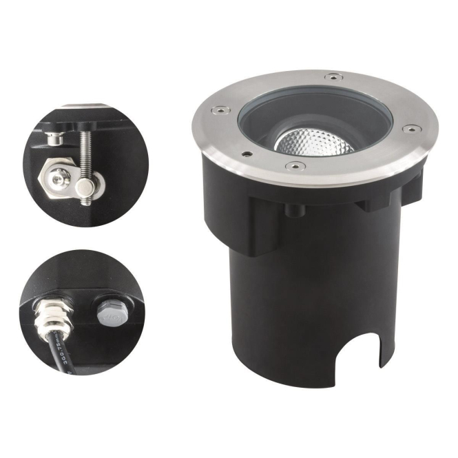 LED-Bodeneinbauleuchte PENTOLA Der Leuchtenkörper der Bodeneinbauleuchte ist aus massivem Aluminium gefertigt, der obere Abdeckring hingegen aus V2A-Edelstahl und kann für vielfältige Anwendungen im Außenbereich verwendet werden. Die Montage erfolgt mittels der im Lieferumfang befindlichen Kunststoff-Einbaugehäuse. Über eine Justierschraube kann die Leuchte im eingebauten Zustand jederzeit geschwenkt werden, der Schwenkwinkel beträgt hierbei 20°. Außerdem entstehen auch keine zusätzlichen Kosten für ein Vorschaltgerät, da der Anschluss direkt an die 230 V-Zuleitung erfolgt. Zur Vermeidung von Kondenswasser befindet sich auf der Unterseite der Leuchte ein selbstentlüftendes Entlüftungsventil. Die maximale Überfahrgeschwindigkeit beträgt bei edelstahl 20 km/h. Die Leuchte hat eine 0,50 m lange Anschlussleitung (ÖLFLEX CLASSIC 110 BLACK 3×0,75 mm 2 ) mit freien Aderenden. Der Ausstrahlwinkel beträgt 38°. Werkstoff des Gehäuses: Aluminium Werkstoff der Abdeckung: Glas transparent Le – Techn.Licht/Wohnraum Aussenleuchten Techn. Aussenleuchte – EVN Bodeneinbaustrahler IP67 PENTOLA 7W 373lm 3K V2a 1,5t D135, schwenkbar