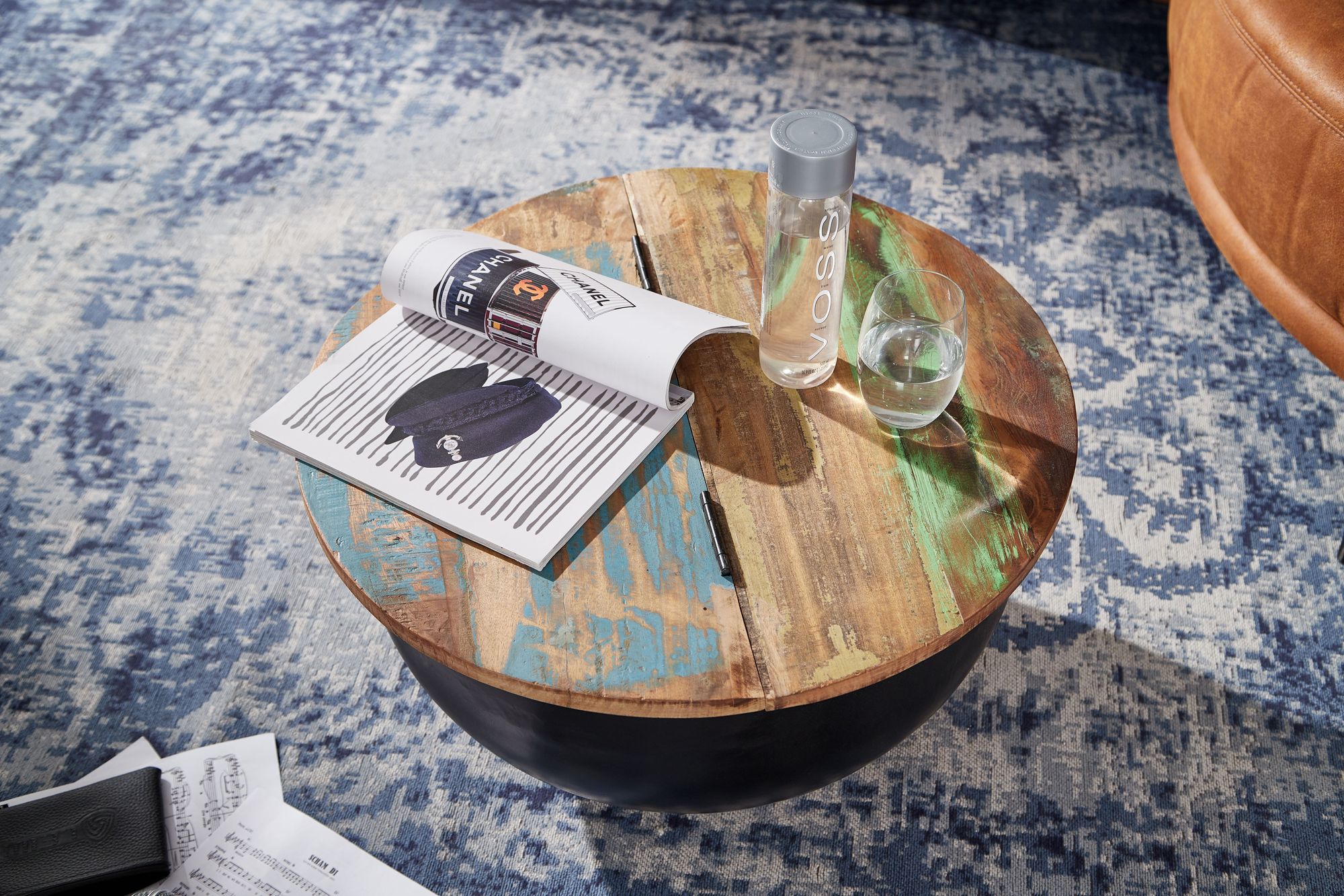 Design • Attraktiver Couchtisch im angesagten Industrial-Stil • Runde Tischplatte zur Ablage von diversen Utensilien • Fester und stabiler Stand dank des robusten Metallkörpers Abmessungen • Breite: 60 cm • Höhe: 34 cm • Tiefe: 60 cm • Stärke der Tischplatte: ca. 2 cm • Höhe des Staufachs: 32 cm • Maße der Öffnung (BxT): 54 x 27 cm • Weitere Abmessungen finden Sie im Maßbild Besonderheiten • Jeder Tisch wurde in liebevoller Handarbeit gefertigt und ist somit ein absolutes Unikat • Aufgrund der Handarbeit kann es zu leichten Farbabweichungen und Unebenheiten kommen • Tischplatte lässt sich auf einer Seite hochklappen und bietet so Stauraum für z.B. Kissen oder Decken • Die Holzoberfläche ist mit einem schützenden Klarlack versiegelt • Empfohlene Maximalbelastbarkeit: 15 kg Material • Tischplatte: Recyceltes Mango Massivholz • Metallgestell: Lackiertes Eisen Lieferumfang • Ein Couchtisch ohne Dekoration Montage • Lieferzustand: komplett montiert und sicher verpackt Pflegehinweise Die Oberfläche mit einem lauwarm angefeuchteten Baumwolltuch reinigen. Keine Scheuermittel, scharfen Reinigungsmittel oder tropfnassen Tücher verwenden.