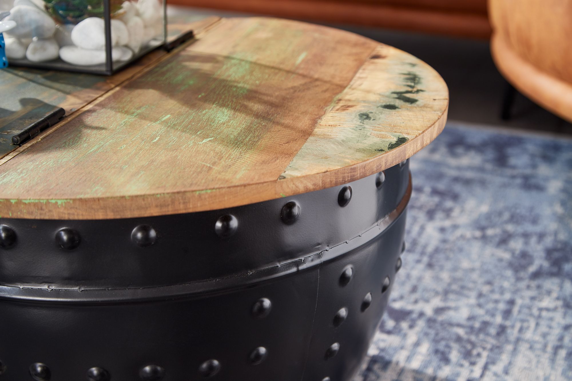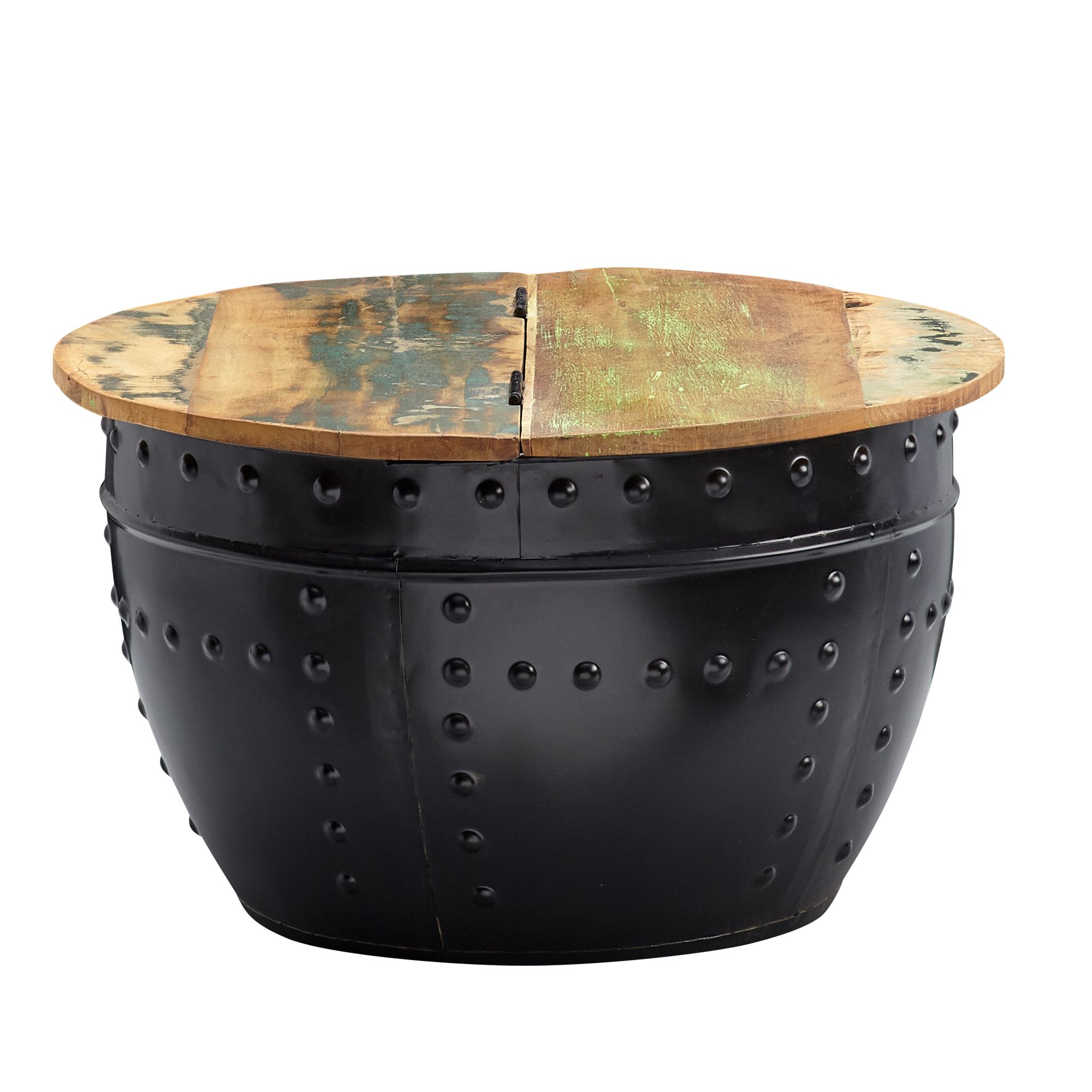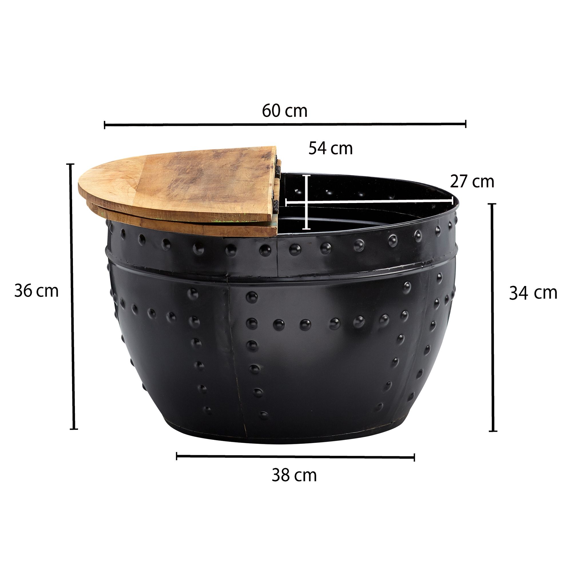 Design • Außergewöhnlicher Couchtisch im angesagten Industrial-Stil • Runde Tischplatte zur Ablage von diversen Utensilien • Fester und stabiler Stand dank des robusten Metallkörpers • Dekorative Nieten zieren das Gestell des Tisches Abmessungen • Breite: 60 cm • Höhe: 36 cm • Tiefe: 60 cm • Stärke der Tischplatte: ca. 2 cm • Höhe des Staufachs: 34 cm • Maße der Öffnung (BxT): 54 x 27 cm • Weitere Abmessungen finden Sie im Maßbild Besonderheiten • Jeder Tisch wurde in liebevoller Handarbeit gefertigt und ist somit ein absolutes Unikat • Aufgrund der Handarbeit kann es zu leichten Farbabweichungen und Unebenheiten kommen • Tischplatte lässt sich auf einer Seite hochklappen und bietet so Stauraum für z.B. Kissen oder Decken • Die Holzoberfläche ist mit einem schützenden Klarlack versiegelt • Empfohlene Maximalbelastbarkeit: 15 kg Material • Tischplatte: Recyceltes Mango Massivholz • Metallgestell: Lackiertes Eisen Lieferumfang • Ein Couchtisch ohne Dekoration Montage • Lieferzustand: komplett montiert und sicher verpackt Pflegehinweise Die Oberfläche mit einem lauwarm angefeuchteten Baumwolltuch reinigen. Keine Scheuermittel, scharfen Reinigungsmittel oder tropfnassen Tücher verwenden.