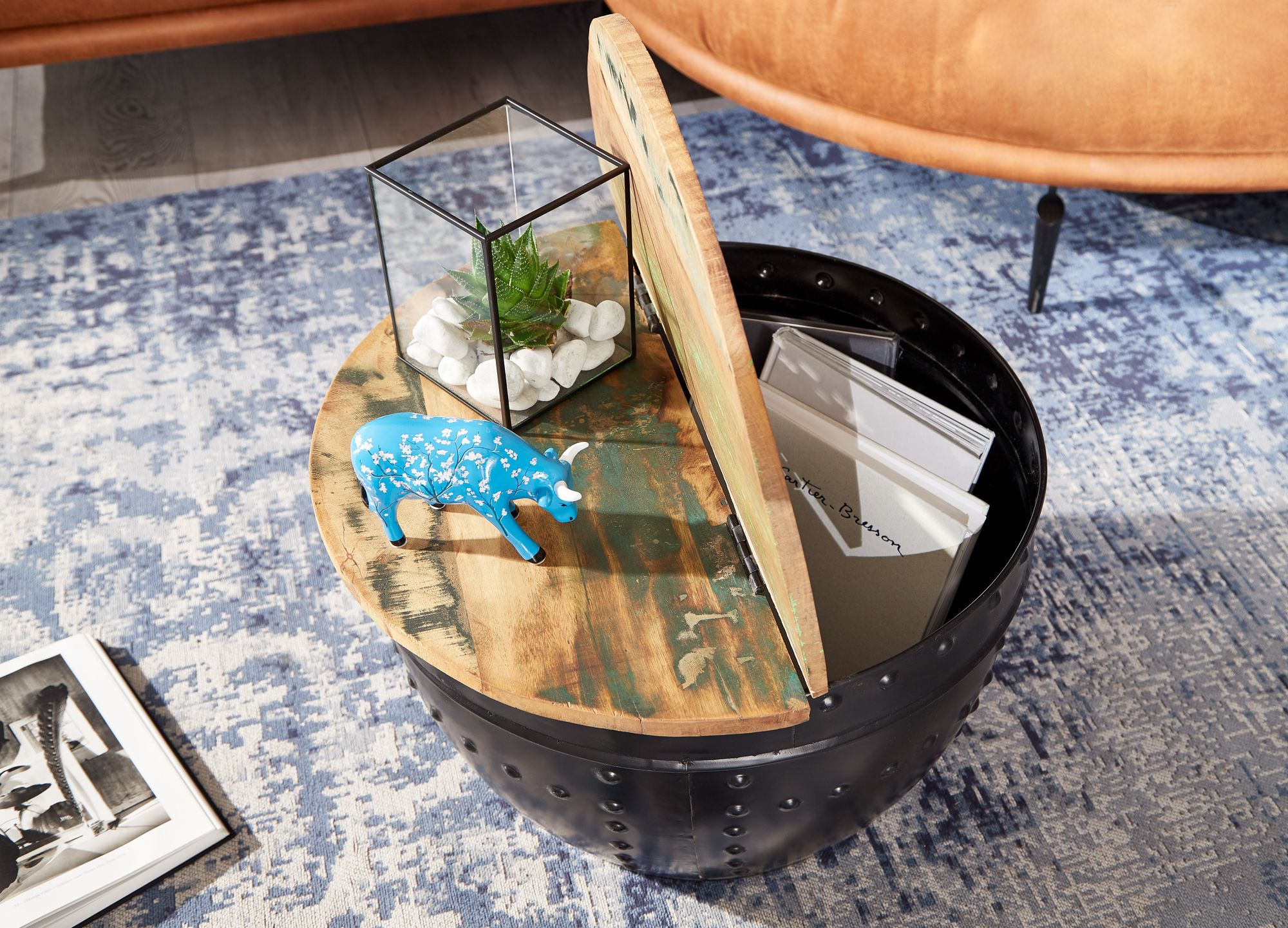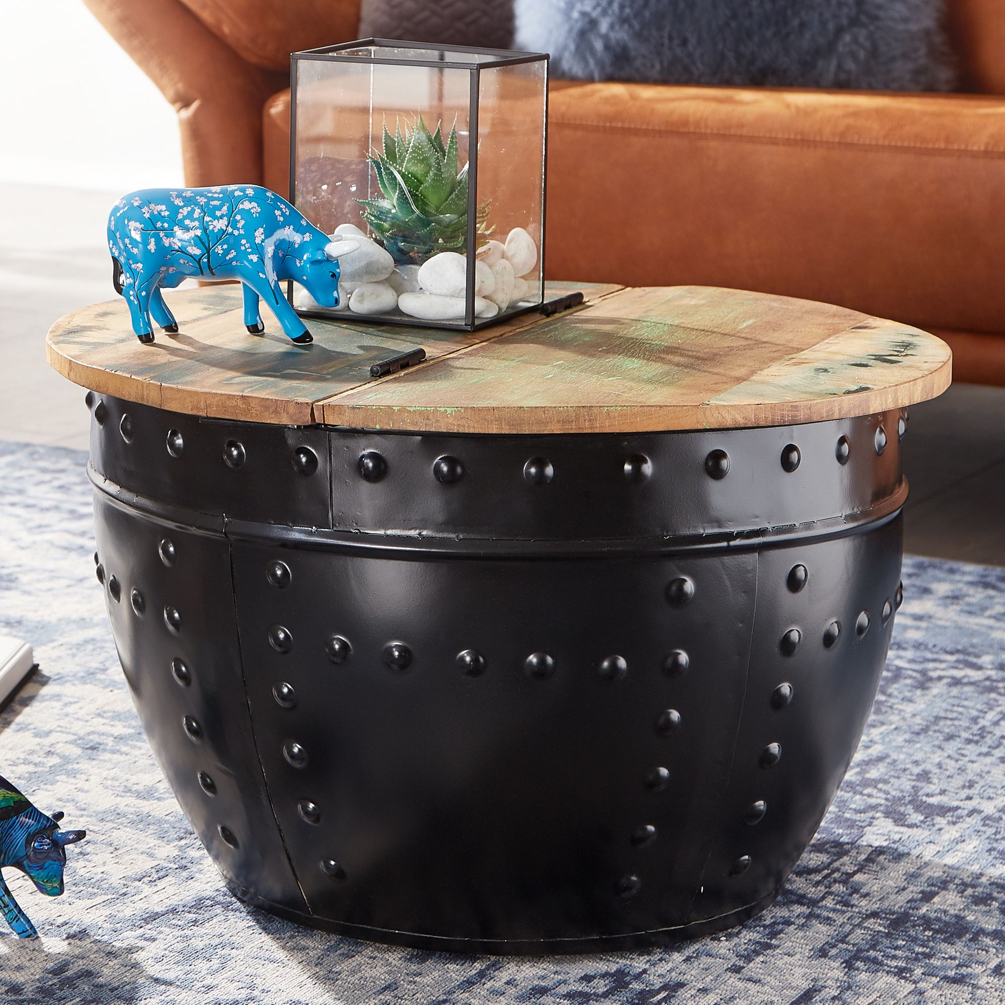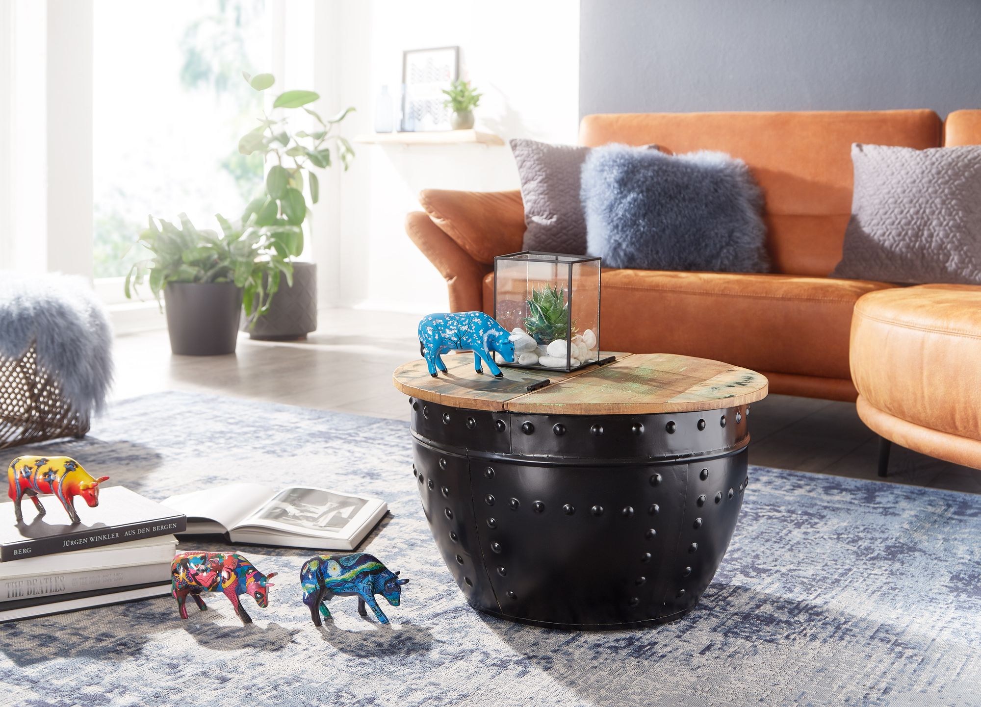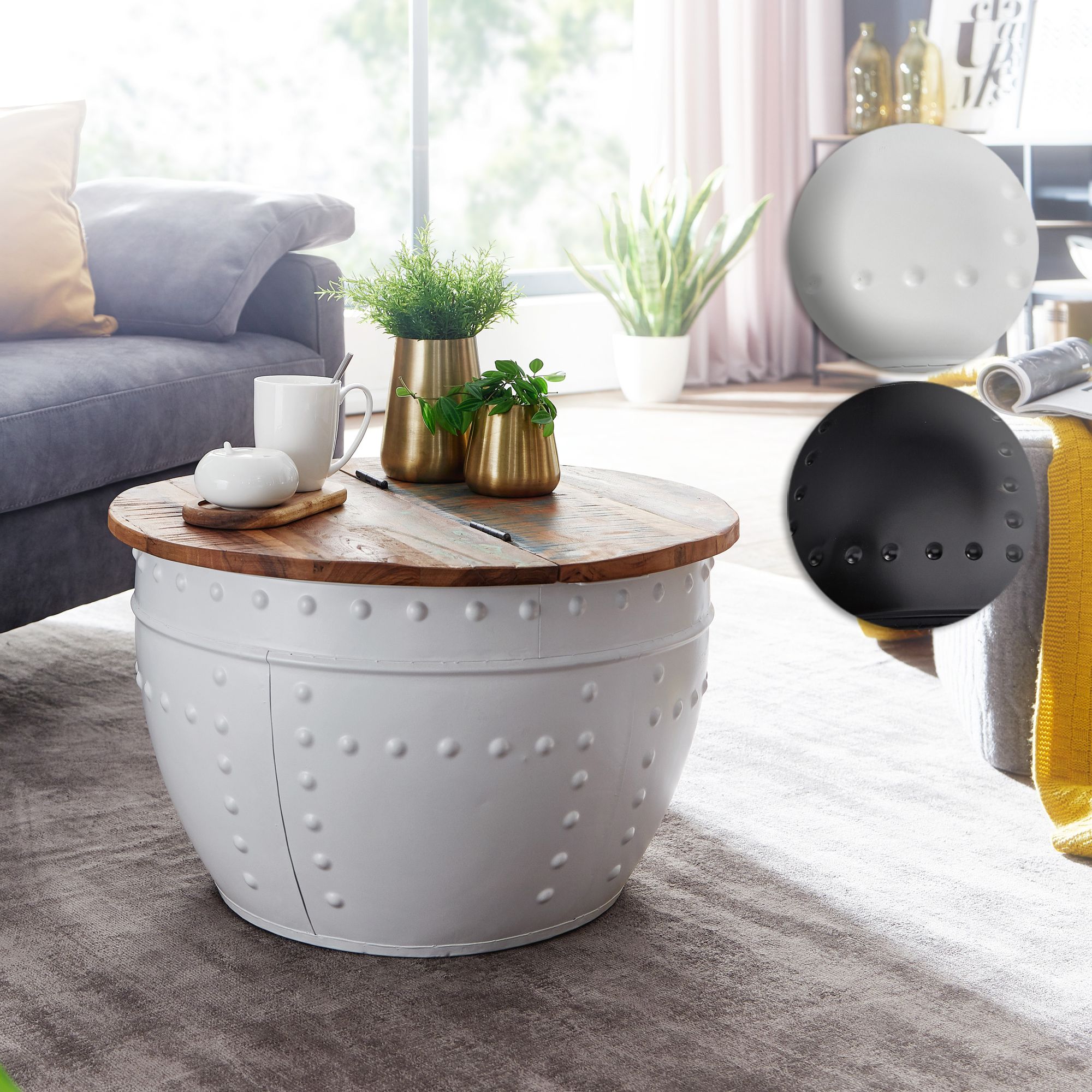 Design • Außergewöhnlicher Couchtisch im angesagten Industrial-Stil • Runde Tischplatte zur Ablage von diversen Utensilien • Fester und stabiler Stand dank des robusten Metallkörpers • Dekorative Nieten zieren das Gestell des Tisches Abmessungen • Breite: 60 cm • Höhe: 36 cm • Tiefe: 60 cm • Stärke der Tischplatte: ca. 2 cm • Höhe des Staufachs: 34 cm • Maße der Öffnung (BxT): 54 x 27 cm • Weitere Abmessungen finden Sie im Maßbild Besonderheiten • Jeder Tisch wurde in liebevoller Handarbeit gefertigt und ist somit ein absolutes Unikat • Aufgrund der Handarbeit kann es zu leichten Farbabweichungen und Unebenheiten kommen • Tischplatte lässt sich auf einer Seite hochklappen und bietet so Stauraum für z.B. Kissen oder Decken • Die Holzoberfläche ist mit einem schützenden Klarlack versiegelt • Empfohlene Maximalbelastbarkeit: 15 kg Material • Tischplatte: Recyceltes Mango Massivholz • Metallgestell: Lackiertes Eisen Lieferumfang • Ein Couchtisch ohne Dekoration Montage • Lieferzustand: komplett montiert und sicher verpackt Pflegehinweise Die Oberfläche mit einem lauwarm angefeuchteten Baumwolltuch reinigen. Keine Scheuermittel, scharfen Reinigungsmittel oder tropfnassen Tücher verwenden.