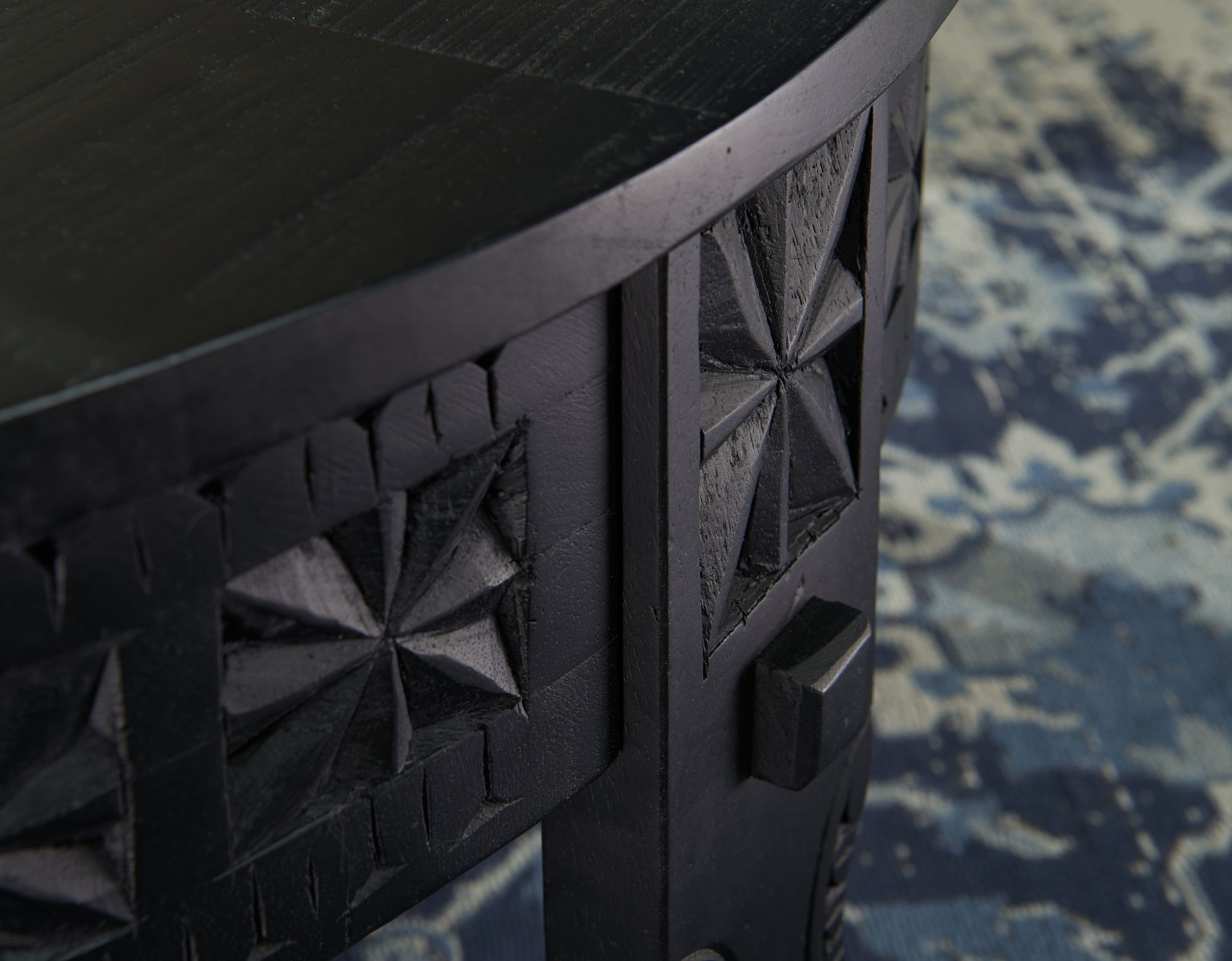 Design • Auffälliger Couchtisch in orientalischem Design • Runde Tischplatte zur Ablage von diversen Utensilien • Tischbeine und Blende mit eleganten Zierfräsungen Farbe • Gesamter Artikel: Schwarz Besonderheiten • Jeder Tisch wurde in liebevoller Handarbeit gefertigt und ist somit ein absolutes Unikat • Aufgrund der Handarbeit kann es zu leichten Farbabweichungen und Unebenheiten kommen • Die Holzoberfläche ist mit einem schützenden Klarlack versiegelt • Extravagantes Muster und geschwungene Tischbeine • Die Maximalbelastbarkeit liegt bei ca. 15 kg Material • Gesamter Tisch: schwarz lackiertes Mango Massivholz Lieferumfang • Ein Couchtisch ohne Dekoration Montage • Lieferzustand: teilmontiert, lediglich die Tischbeine müssen angebracht werden • Montageanleitung und -material liegen der Lieferung bei Pflegehinweise Die Oberfläche mit einem lauwarm angefeuchteten Baumwolltuch reinigen. Keine Scheuermittel, scharfen Reinigungsmittel oder tropfnasse Tücher verwenden.