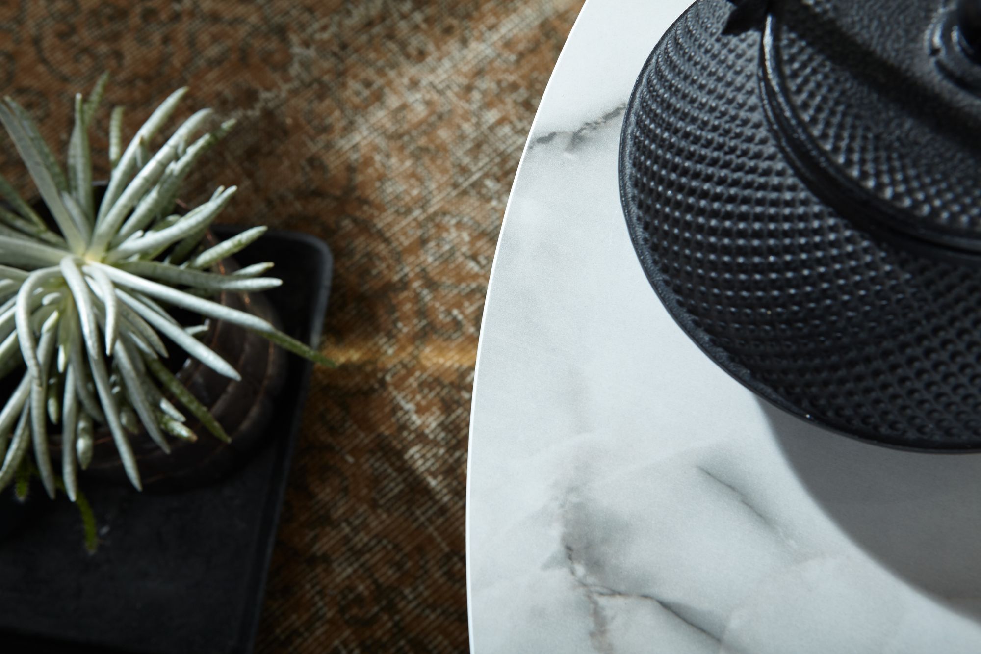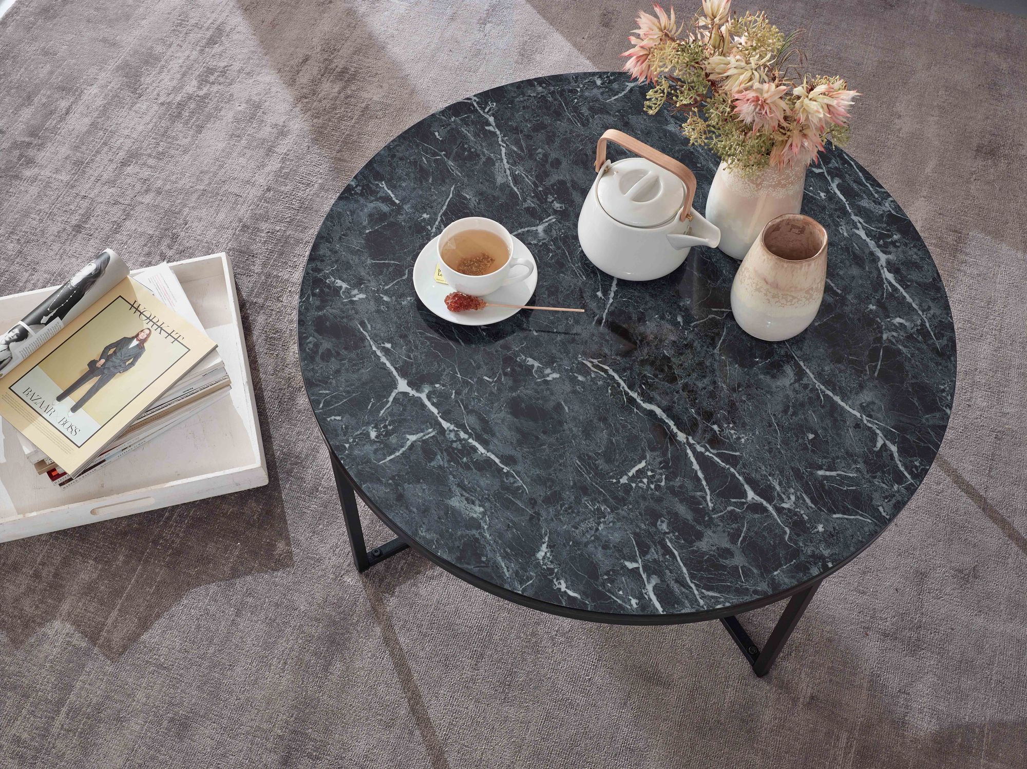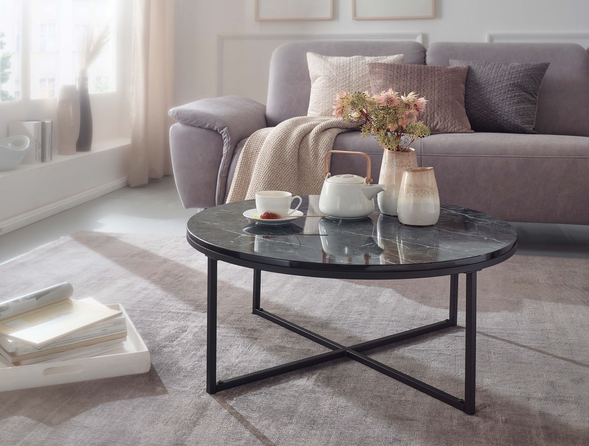 Design • Runder Sofatisch mit anmutiger Marmor-Optik • Stylischer Wohnzimmertisch in edler Farbkombination Abmessungen • Breite: 80 cm • Höhe: 36 cm • Tiefe: 80 cm • Durchmesser Tischplatte: 80 cm • Tischplattenstärke: 1,5 cm Besonderheiten • Sicherer Stand dank der überkreuzten Beinanordnung • Aufgrund des Designs lässt sich der Tisch in vielen Zimmern einsetzen • Edles Flair dank der Marmoroptik • Kunststoffnoppen an den Beinen verhindern ein Verkratzen Ihres Bodens • Empfohlene max. Belastbarkeit: 8 kg Material • Tischplatte: foliertes MDF (mit PVC-Beschichtung) • Gestell: Stahl Lieferumfang • Ein Couchtisch ohne Dekoration • Montageanleitung und -material liegen der Lieferung bei Montage • Lieferzustand: zerlegt und sicher verpackt Pflegehinweise Die Oberfläche mit einem lauwarm angefeuchteten Baumwolltuch reinigen. Keine Scheuermittel, scharfe Reinigungsmittel oder tropfnasse Tücher verwenden.
