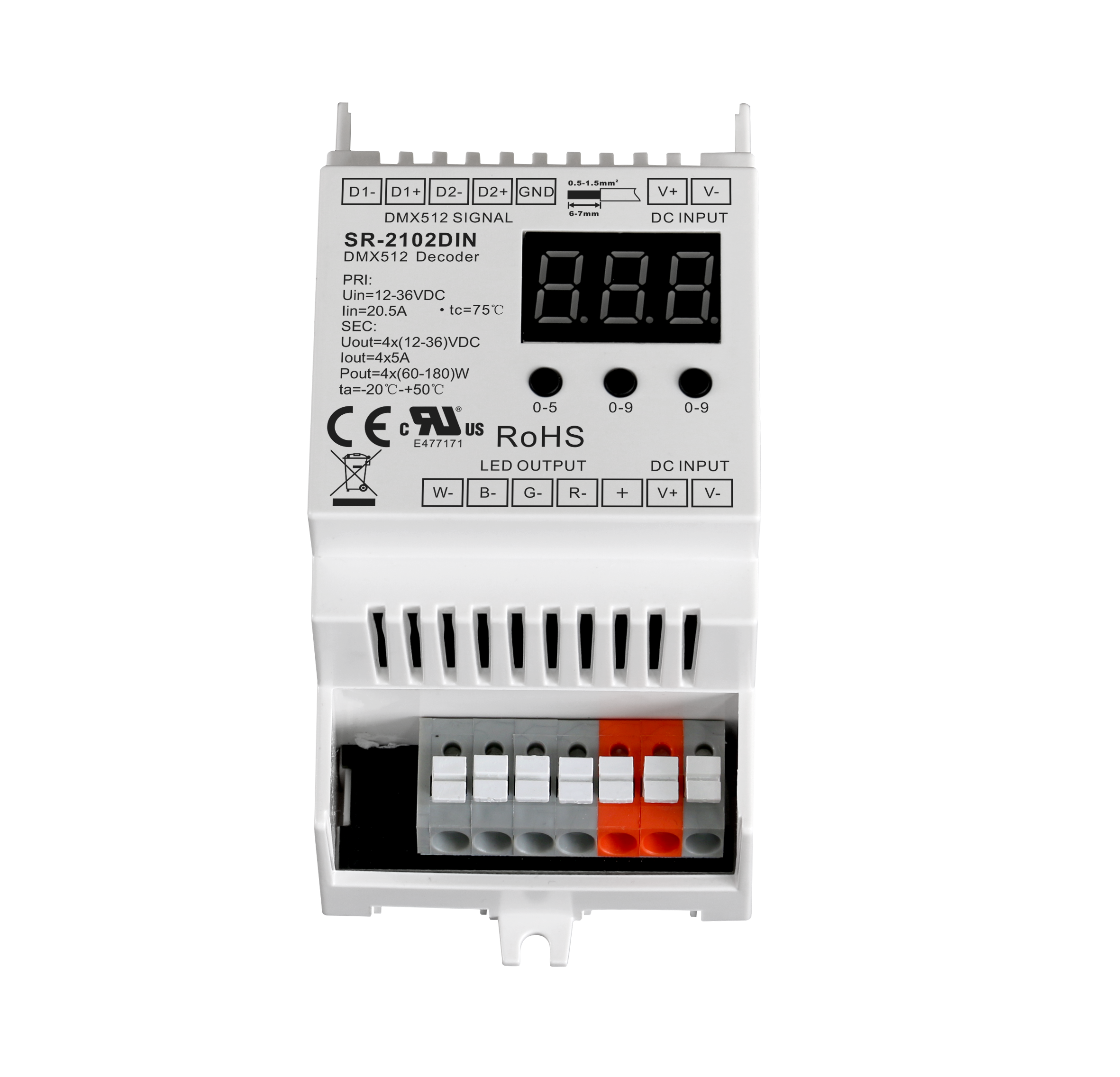 SR-2102DIN Hutschienen DMX512 Decoder – 4-Kanal RGBW 12–48 V, RDM & OTA